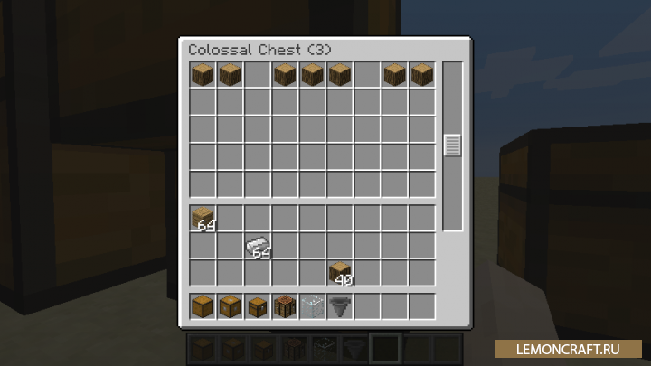 Мод Colossal Chests добавляет в игру более вместительные сундуки, чем стандартные. С этим модом вы сможете делать реально вместительные сундуки, куда сможете положить огромное количество предметов. Для создание такого сундука вам понадобиться специальный блок - расширитель. Теперь вы сможете найти место для всего вашего барахла, что накопилось у вас во время игры.
