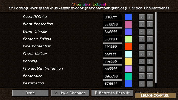 Мод на цветные зачарования Truly Magical Enchantment Glints добавляет в игру возможность окраски зачарованных предметов в разные цвета. Теперь вы можете просто взглянув на вещь понять, какое именно зачарование на него наложено. В настройках мода вы сможете сами установить нужный вам цвет на определенные чары. Кроме этого в настройках мода вы можете выключить/включить руническую текстуру предметов.
