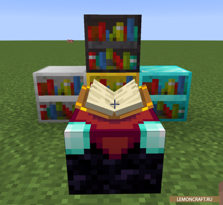Мод на продвинутые книги Enchanting Books добавит в игру усовершенствованные книги, а так же полку для этих книг. В игре появятся железные, золотые, алмазные и незеритовые книги, стоимость которых превышает стоимость обычных книг, но при этом увеличивает шанс получить более сильные виды зачарований , при этом используется меньшее количество полок.