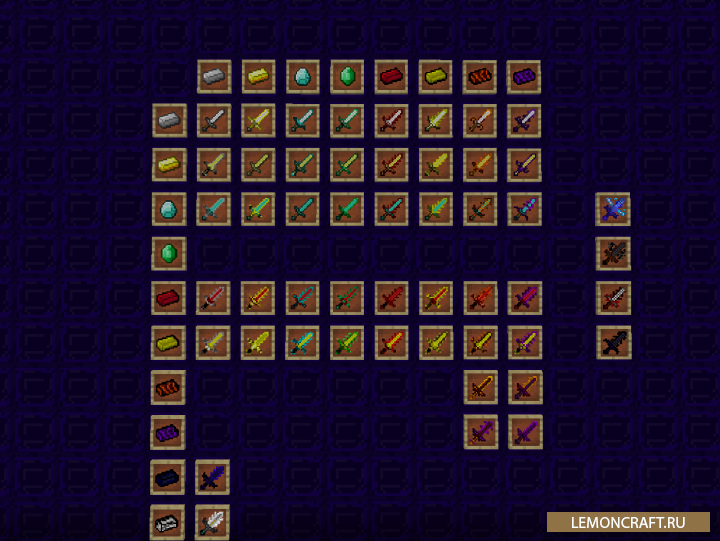 Мод на уникальное оружие Nonexistent+ добавляет в игру новое оружие, броню и материалы. С помощью данного мода вы сможете создавать уникальные мечи, комбинируя различные материалы. Например вы можете создать алмазный меч, покрытый изумрудами. Так мод добавляет усиленные кирки и специальные мечи, которые значительно превосходят обычные.